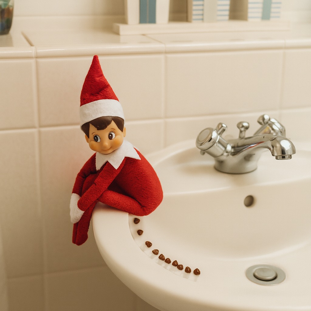 El elfo ha optado por el humor “delicado” y se ha puesto especialmente travieso en el baño. Sentado muy inocente en el borde del lavabo, ha dejado un caminito sospechoso que puede provocar más de un susto a primera vista.