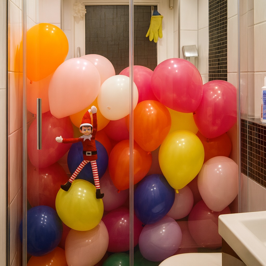 Esta vez el elfo ha decidido organizar su propia fiesta privada… ¡Dentro de la ducha! Ha llenado todo el espacio de globos de colores y se ha quedado ahí posando como el anfitrión más orgulloso del mundo. Parece encantado con su obra, aunque quien vaya a ducharse por la mañana se va a llevar una sorpresa monumental. ¡No hay día sin travesura!