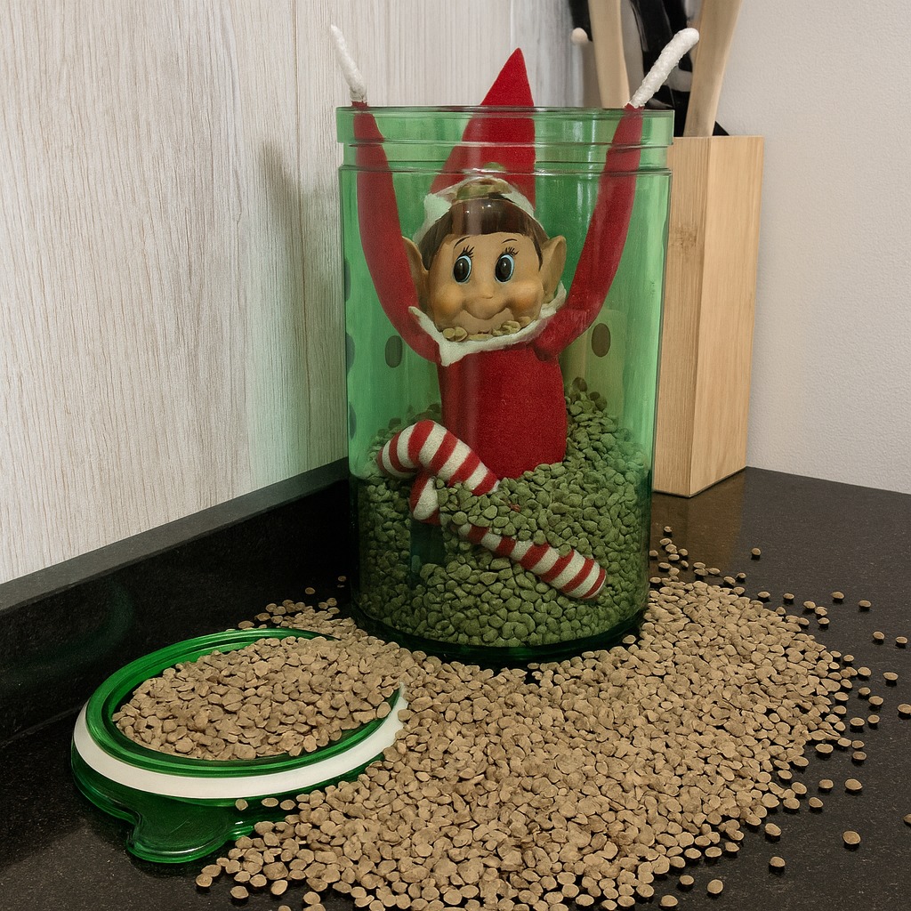 Una divertida travesura en la cocina consiste en colocar al travieso elfo dentro de un tarro transparente lleno de lentejas o de arroz, como si hubiera logrado meterse ahí por sí mismo en un intento de esconderse. Esparce lentejas o arroz un poco alrededor del tarro sobre la encimera para añadir al efecto de su juguetona travesura. ¡El peque se va a reír mucho!