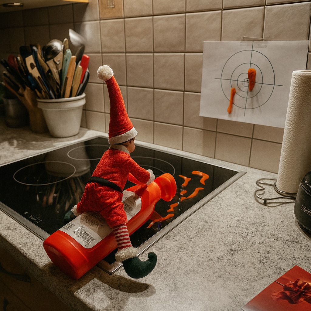 ¡Parece que el elfo ha decidido practicar puntería en la cocina! Se ha subido a una botella de salsa y ha estado disparando chorros contra una diana improvisada. Viendo el “resultado”, está claro que se lo ha pasado en grande… aunque limpiar después igual no le hace tanta gracia a la familia. ¡Menudo artista culinario tenemos en casa!