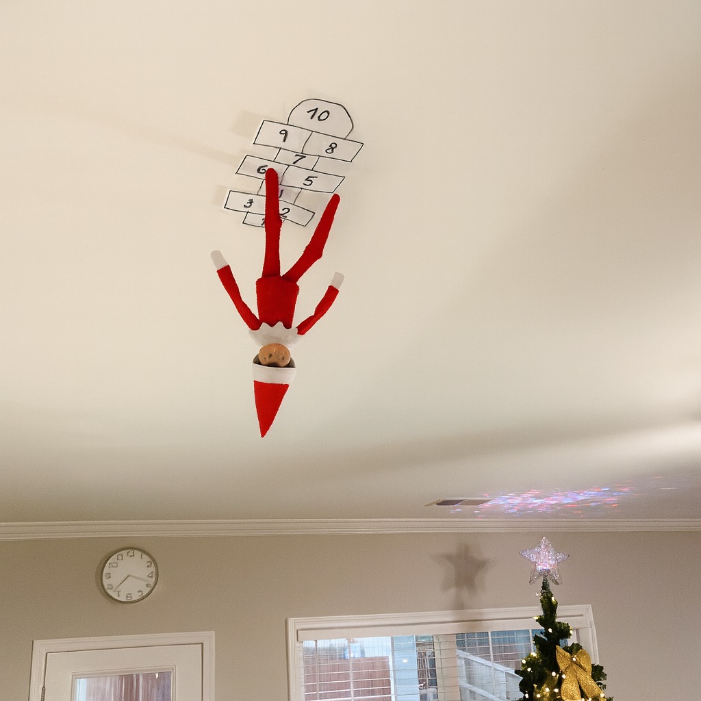 ¡Este elfo ha llevado sus travesuras a nuevas alturas! Colgado del techo boca abajo, está saltando y jugando a la rayuela, que tanto gusta a los peques. ¡Cómo se van a reír los niños y niñas al verlo así!