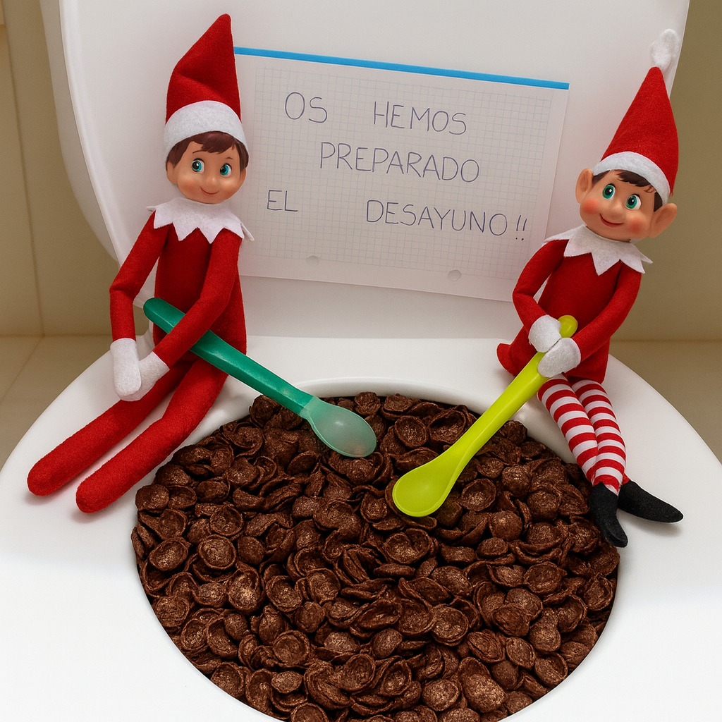 ¡Estos traviesos elfos sí que saben cómo empezar el día con buen humor! Nos preparan el desayuno de una forma muy peculiar… ¡en el baño! Con cucharas en mano, nos han dejado una montaña de cereales en el inodoro. ¿Quién se atreve a probar este desayuno tan original? ¡Es que estos elfos no dejan de sorprender cada mañana!