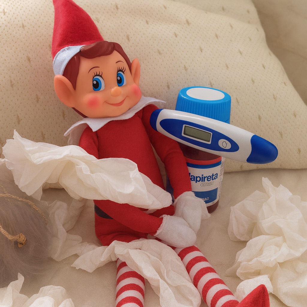 Tanto salir al Polo Norte, el pequeño elfo travieso se ha puesto malo, y no para de tirar mocos. Está rodeado de pañuelos y se ha puesto el termómetro.