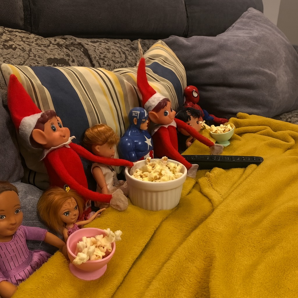 ¡El elfo se ha reunido con otros amigos en el sofá para ver una peli! Y, por supuesto, lo ha preparado bien, ¡hasta tiene palomitas!