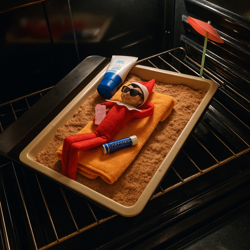 ¡Este elfo empezó sus vacaciones anticipadas! Ha convertido la bandeja del horno en su playa privada, con toalla, crema solar y hasta sombrilla incluida. Ahí está, tumbado a lo grande como si estuviera tomando el sol en pleno Caribe… aunque el “calor” lo tenga a mano con solo girar una rueda. ¡Parece que alguien se ha tomado muy en serio eso de relajarse!