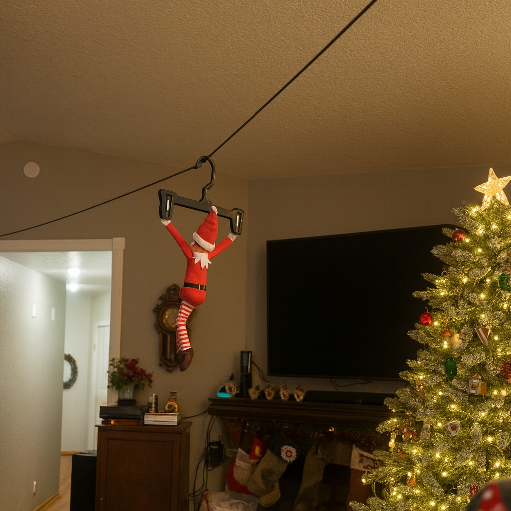 ¡Parece que a este elfo le ha dado por las aventuras extremas! Ha improvisado una tirolina casera y ahora cruza el salón colgado de una percha como si fuera un auténtico equilibrista navideño. ¡Con rumbo directo hacia el árbol, va disfrutando del viaje como si estuviera en un parque de atracciones!