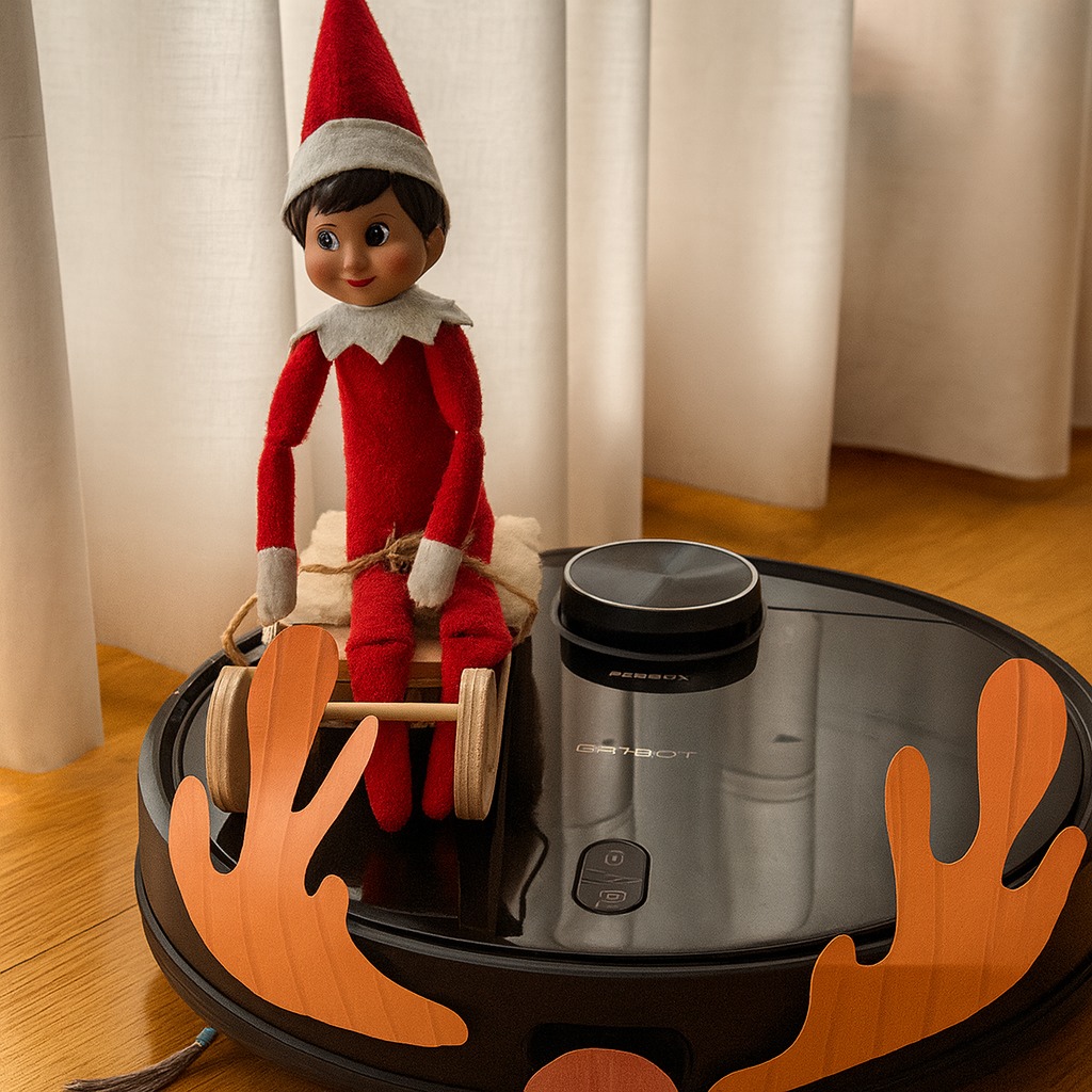 ¡El elfo ha encontrado un nuevo medio de transporte! Hoy ha convertido el robot aspirador en su trineo motorizado y recorre la casa a toda velocidad, saludando como si estuviera en pleno desfile navideño. Con su trineo improvisado y una gran sonrisa, parece dispuesto a limpiar… ¡pero solo de pura diversión!