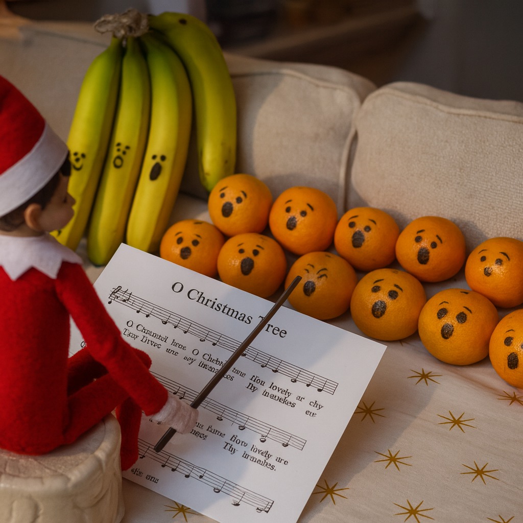Hoy el elfo se ha venido arriba y ha montado ¡su propio coro navideño! Ha reunido a un grupo de mandarinas “cantoras” y hasta a unos plátanos en la sección de público, todos atentos a la partitura. Con su batuta en mano, dirige el recital como todo un maestro musical. ¡Quién iba a decir que la fruta también tenía espíritu navideño!