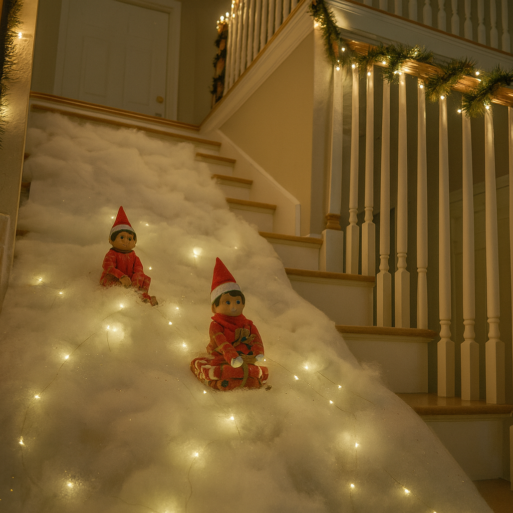¡Los elfos se han traído la nieve directamente a casa! Han convertido la escalera en una gran pista de trineo navideña, completa con luces y todo. Sentados sobre sus improvisados trineos, parecen listos para lanzarse cuesta abajo en cualquier momento. Eso sí, quien suba o baje las escaleras hoy… ¡que tenga cuidado, porque la diversión ya está en marcha!